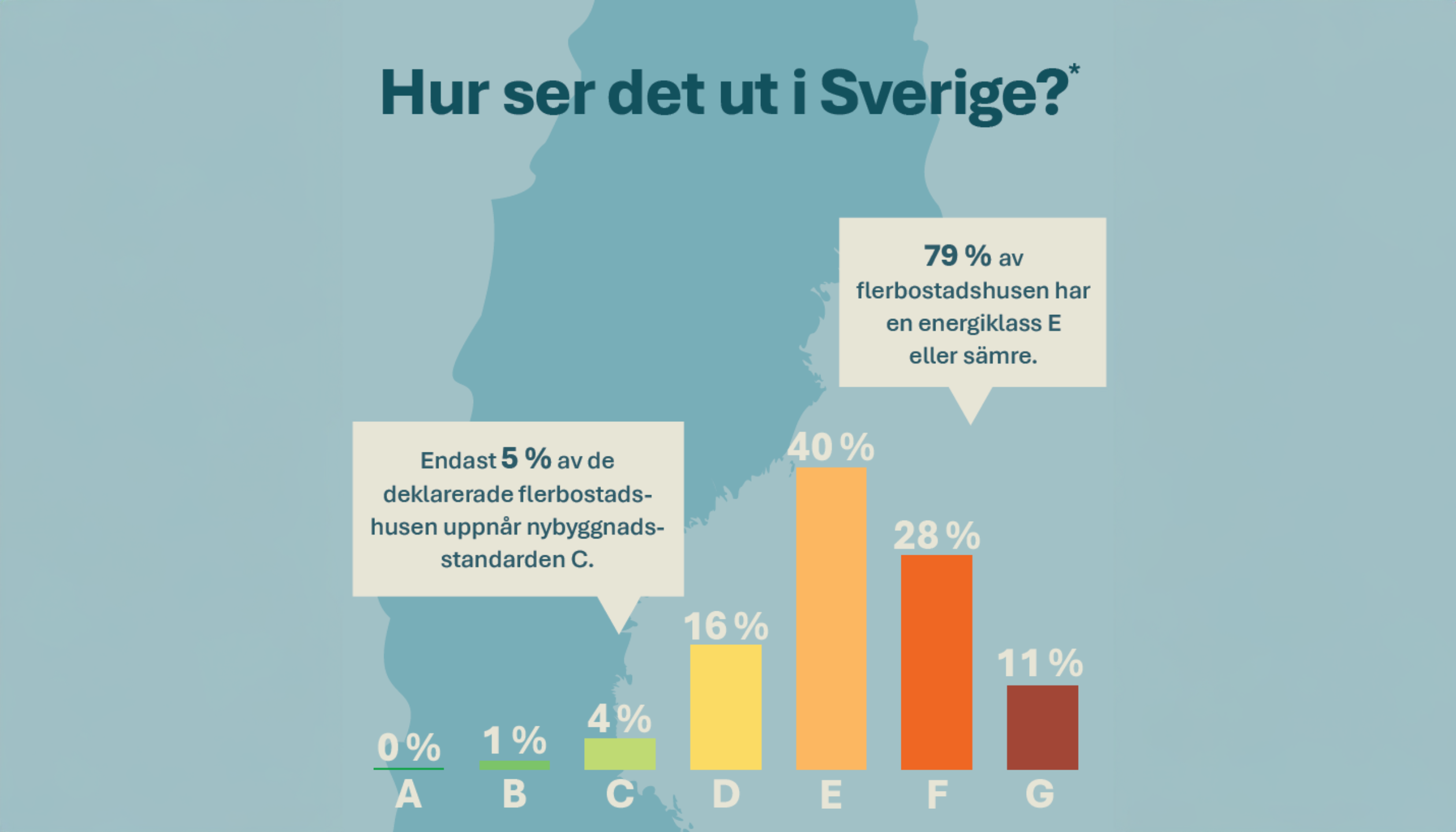 Vi visar också hur stort renoveringsbehovet är. Mer än 75% procent av Sveriges flerbostadshus ligger idag på energiklass E eller sämre. Samtidigt står byggnaderna inför krav från både Sverige och EU som innebär att energianvändningen måste ner kraftigt. Foldern förklarar vad som krävs och hur en stegvis och smart renoveringsprocess kan möta utvecklingen.